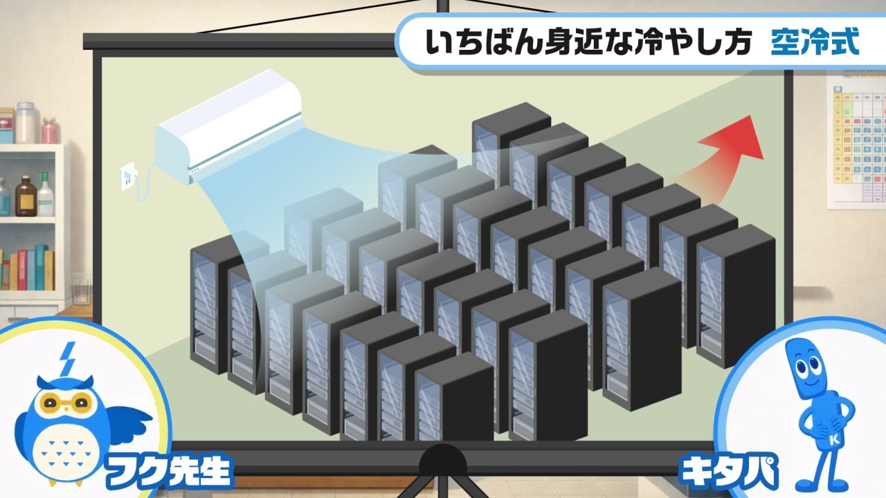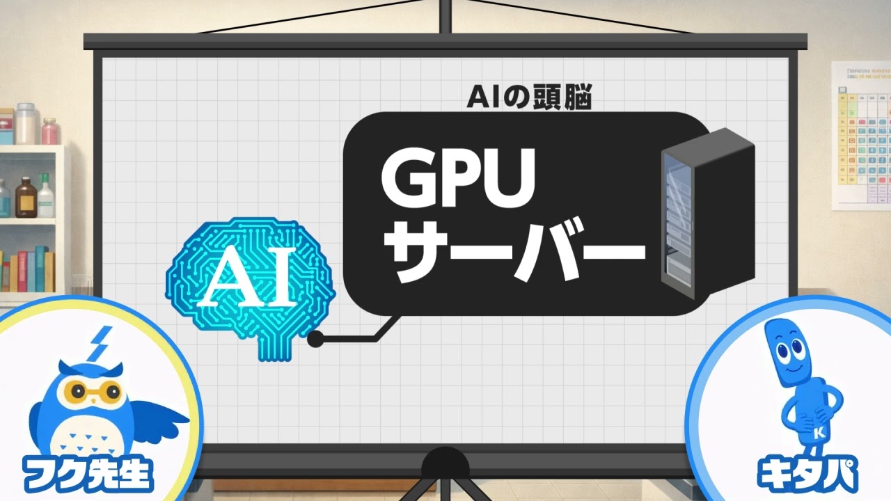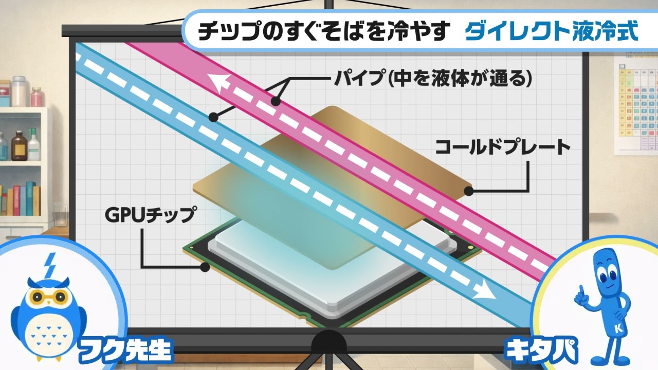 解説動画 「GPUサーバーの冷却方式の違い」 投稿日 2026年3月3日 著者 harada カテゴリー 事業動画 北浜キャピタルパートナーズが取り組む、データセンター事業に関連してGPUサーバーの冷却方式の違いについて解説します。⇒ 全編版(時間 09:49)はこちら 第1章AIとGPUサーバー 第2章空冷式:いちばん身近な冷やし方 第3章ダイレクト液冷式:チップのすぐそばを冷やす 第4章液浸冷却式:まるごとお風呂にドボン 第5章まとめ 全編版(時間 9:49)