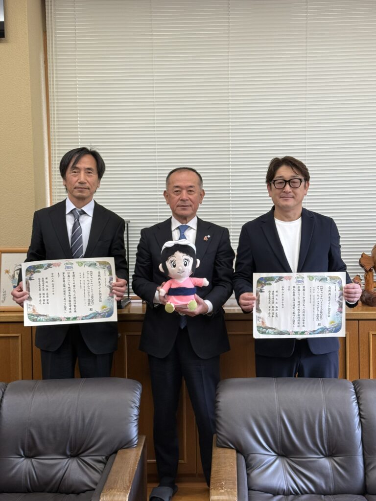 〔左:当社児玉副社長。右:北浜GRF斉藤氏〕 〔中央:木下五木村長〕